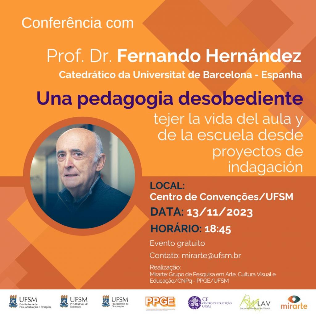 É com imensa satisfação que a Direção do Centro de Educação (CE) convida toda a comunidade educativa para a Conferência com o Prof. Dr. Fernando Hernández, da Universidad de Barcelona, Espanha. O evento será no dia 13/11/2023, às 18h45min, no Centro de Convenções da UFSM. A palestra intitulada “Uma Pedagogia Desobediente: tecer a vida da sala de aula e da escola a partir de Projetos de Indagação” abordará uma retomada de suas perspectivas em diálogo com novos atravessamentos conceituais e metodológicos que constituem seus enfoques de pesquisa dos últimos anos.