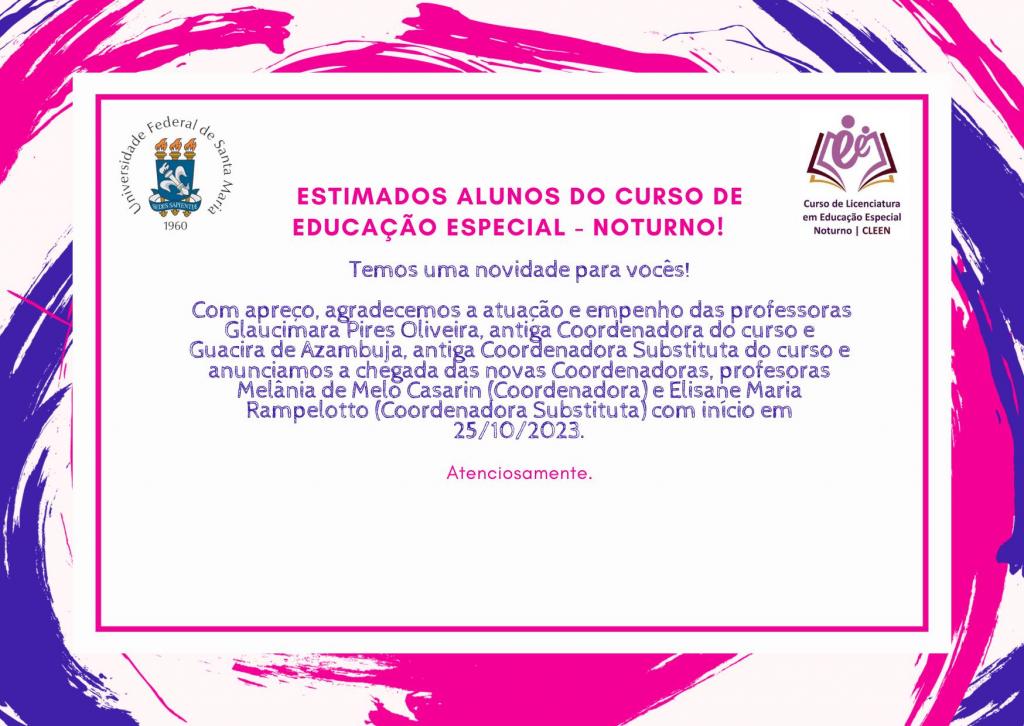 Além da proposta de alteração da logo, a consulta pública também visou à escolha da nova coordenação para o referido curso, em que sagraram-se eleitas as professoras Melânia de Melo Casarin (Coordenadora) e Elisane Maria Rampelotto (Coordenadora Substituta), que iniciaram sua gestão em 25/10/2023. A coordenação anterior era composta pelas professoras Glaucimara Pires Oliveira (Coordenadora) e Guacira de Azambuja (Coordenadora Substituta).