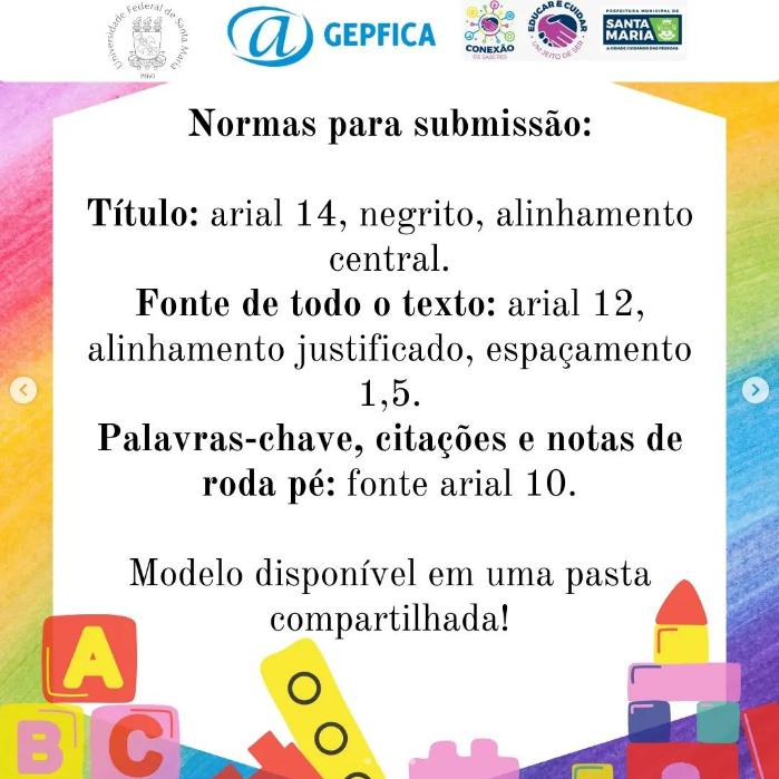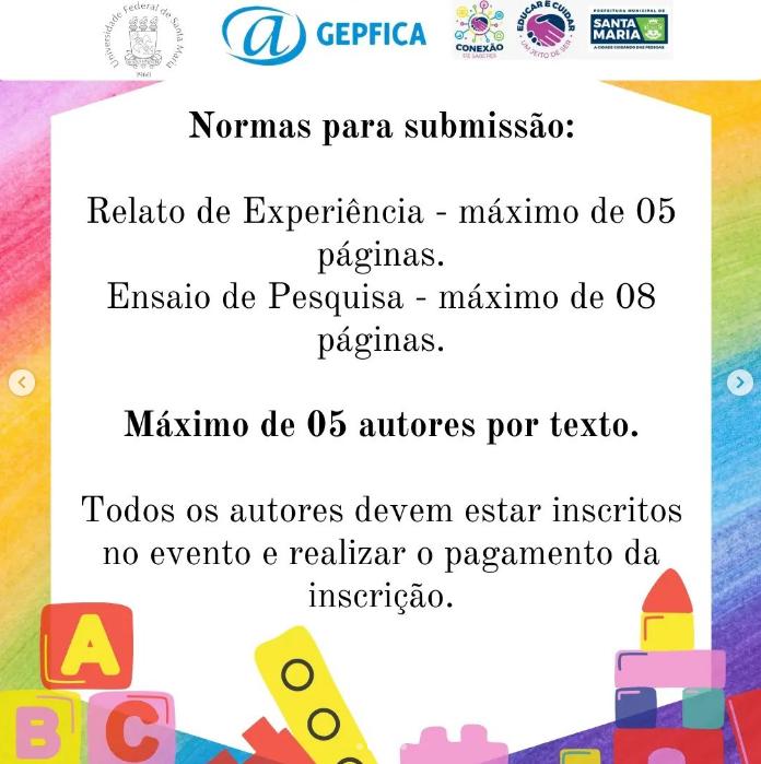 O evento aceita propostas de submissão de trabalhos como Relato de Experiência e Ensaio de Pesquisa, também aceita propostas de Oficinas de Alfabetização, além da participação nas mesas redondas e conferências. O prazo para envio de trabalhos é até o dia 06/11/2023.