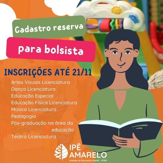 A Unidade de Educação Infantil Ipê Amarelo torna público que estão abertas as inscrições à seleção de cadastro reserva de bolsista para o turno da tarde. Podem concorrer estudantes regularmente matriculados na Universidade Federal de Santa Maria.