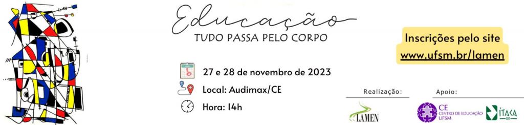 Nos dias 27 e 28 de novembro de 2023, no Centro de Educação da UFSM (CE), ocorre o evento Educação: tudo passa pelo corpo, promovido pelos Laboratórios de Metodologia do Ensino (LAMEN).  Inscrições estão abertas a partir de hoje (20) e seguem até a próxima sexta-feira (24), por meio do formulário eletrônico.