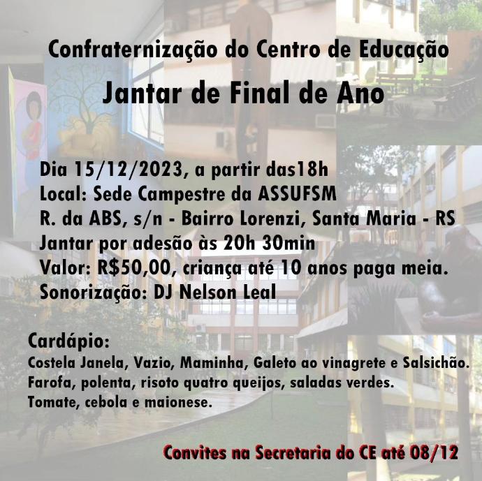 A equipe da Direção do Centro de Educação (CE) informa a toda comunidade interessada sobre a confraternização sob a forma de Jantar de Final de Ano, a ser realizado no dia 15/12/2023, às 20h30min, na Sede Campestre da Associação dos Servidores Técnico-Administrativos da UFSM (ASSUFSM). O valor dos convites é de R$ 50,00 para o público em geral, sendo que crianças de até 10 anos pagam meio convite, ou seja, R$ 25,00.