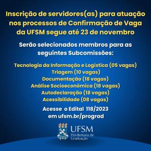 A Pró-Reitoria de Graduação da UFSM (PROGRAD) informa que está com inscrições abertas para a seleção de servidores(as) que atuarão nos procedimentos de confirmação de vaga no ano de 2024, referente ao processo seletivo seriado e vestibular, através do Edital 118/2023-PROGRAD/UFSM (clique aqui).