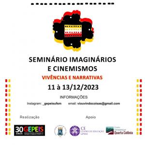 O Grupo de Estudos e Pesquisas em Educação e Imaginário Social (GEPEIS), vinculado ao Centro de Educação (CE), convida toda a comunidade a participar do Seminário Imaginários e Cinemismos: Vivências e Narrativas, que será realizado nos dias 11, 12 e 13 de dezembro, nas dependências do CE, sala 215 e auditório Audimax, no turno da manhã: na segunda, terça e quarta-feira (a partir das 8h); e no turno da tarde: apenas na segunda-feira (a partir das 14h). Confira aqui a programação do evento.