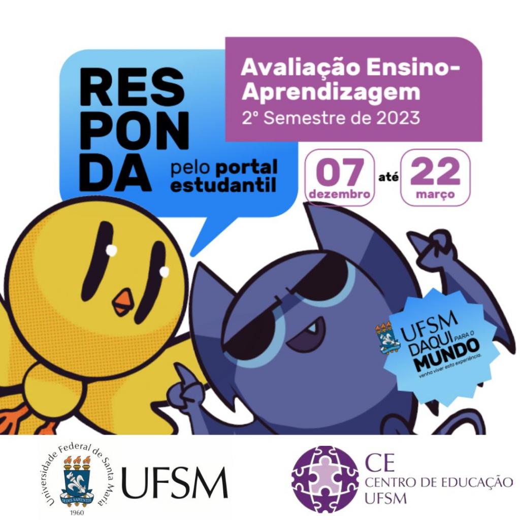 De 07/12/2023 a 22/03/2024 está disponível no Portal Estudantil a Avaliação Ensino-Aprendizagem, pelo(a) aluno(a). É muito importante a participação de estudantes da graduação e pós-graduação no processo de avaliação de seu professor(a). Colabore para uma UFSM cada vez melhor para você e para todos(as)!