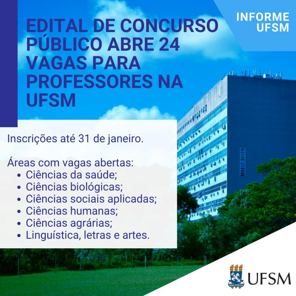 Dos dias 02 a 31 de janeiro de 2024, estarão abertas as inscrições para o concurso público que disponibiliza 24 vagas para professores na UFSM, sendo todas elas para o campus sede da instituição. Dentre as oportunidades, há uma vaga para docente no Centro de Educação (CE). O processo seletivo é constituído de prova escrita, prova didática, defesa da produção intelectual, prova de títulos e, dependendo do caso, prova prática. Os candidatos devem inscrever-se via internet, na página do concurso (clique aqui), onde também se encontra o edital completo, com requisitos, anexos e atualizações.