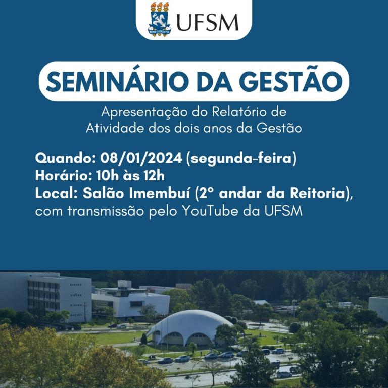 No dia 08 de janeiro, a gestão da UFSM fará um seminário para apresentação de relatório das atividades desenvolvidas e resultado obtidos ao longo dos primeiros dois anos em que esteve à frente da reitoria. O evento acontece das 10h às 12h, no salão Imembuí, 2º andar do prédio da reitoria e terá transmissão pelo Youtube da UFSM (clique aqui)