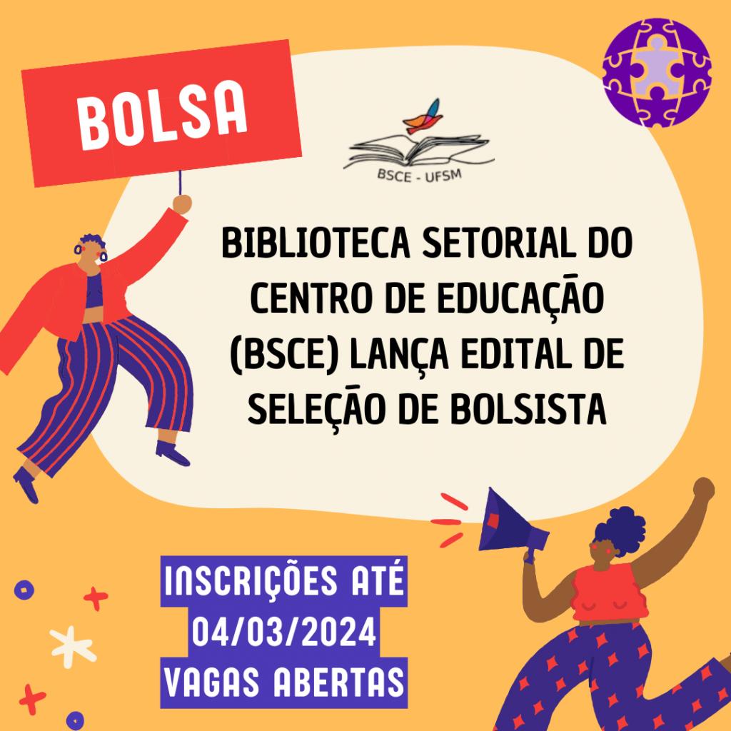 No dia 16 de fevereiro, a Biblioteca Setorial do Centro de Educação (BSCE) lançou o Edital 01/2024-BSCE referente ao processo de seleção de bolsistas para suporte administrativo no setor. Dentre os requisitos, o(a) estudante precisa estar regularmente matriculado em um curso de graduação ou pós-graduação da UFSM.