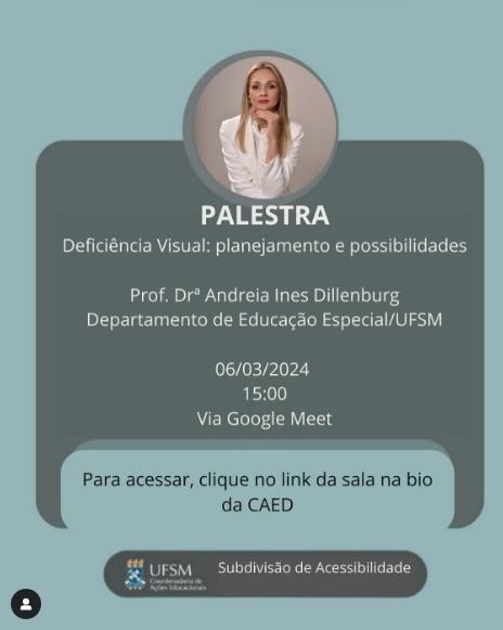Descrição da imagem: Card com fundo verde água. Centralizado, um quadrado cinza com as informações, uma abaixo da outra: “Palestra” “Deficiência Visual: planejamento e possibilidades.” “Profa. Dra. Andreia Ines Dillenburg. Departamento de Educação Especial/UFSM” “06/03/24; 15:00; Via Google Meet”. Logo abaixo, dentro de um retângulo verde água, lê-se “Para acessar, clique no link da sala na bio da Caed”. Centralizada na parte superior do retângulo cinza, uma fotografia da profa. Andreia, da cintura para cima, ela é loira, tem cabelos longos e está com o queixo apoiado na mão esquerda. Centralizado, na parte inferior, o brasão da UFSM com “UFSM Coordenadoria de Ações Educacionais” ao lado e à direita “Subdivisão de Acessibilidade”. Fim da descrição.