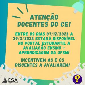 O questionário está disponível nos portais institucionais da UFSM: portal docente, estudantil e do servidor. A participação de todos e todas contribui para o aprimoramento das ações e desenvolvimento institucional do CE.