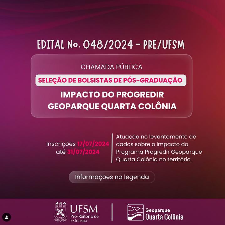A Pró-Reitoria de Extensão da Universidade Federal de Santa Maria (PRE/UFSM), por meio da Área de Desenvolvimento Regional, torna pública a abertura de inscrições de bolsistas, acadêmicas/os de cursos de Pós-Graduação, matriculadas/os na UFSM, para atuarem no levantamento de dados sobre o impacto do Programa Progredir Geoparque Quarta Colônia no território.