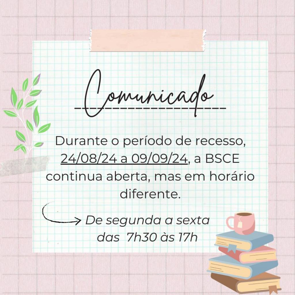 Durante as férias acadêmicas, a Biblioteca Setorial do Centro de Educação (BSCE) estará com horário de atendimento ao público alterado.