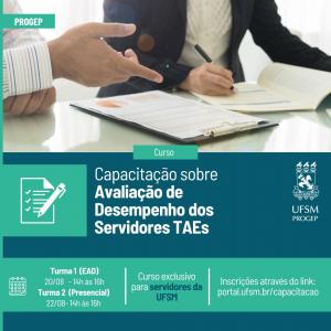 A Avaliação de Desempenho Funcional dos Servidores Técnico-Administrativos em Educação na UFSM ocorre anualmente e este ano está sendo realizada de 05 a 30 de agosto. Para tornar a participação de todos mais efetiva, a Pró-Reitoria de Gestão de Pessoas (PROGEP) irá ofertar duas turmas da Capacitação sobre Avaliação de Desempenho dos Servidores TAEs, com o objetivo de capacitar as chefias da Instituição e os servidores Técnico-Administrativos em Educação, no intuito de esclarecer a metodologia e reforçar a cultura da Avaliação de Desempenho na instituição.