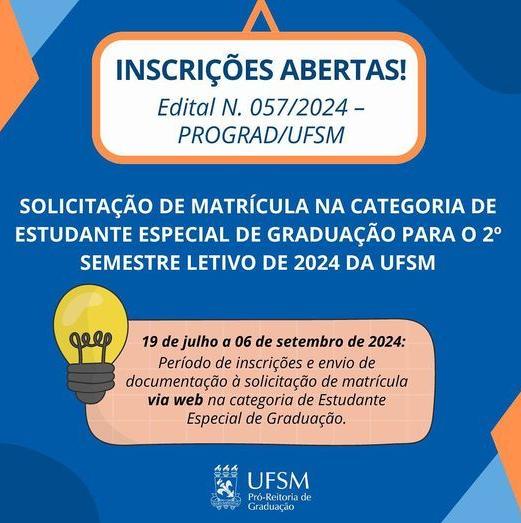 ➡️ Até o dia 06 de setembro, estão abertas as inscrições para o Edital 057/2024 – PROGRAD, que regulamenta a solicitação de matrícula na categoria de ESTUDANTE ESPECIAL em disciplinas de Graduação para o 2º semestre letivo de 2024 na UFSM.