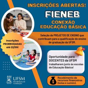 A Pró-Reitoria de Graduação (Prograd) divulga o novo prazo para docentes da UFSM submeterem seus projetos ao Fundo de Ensino Conexão Educação Básica (FIEnEB 2024). Há oportunidade para desenvolver componentes curriculares de sua disciplina junto às escolas da Educação Básica e receber recursos financeiros (bolsa e custeio).