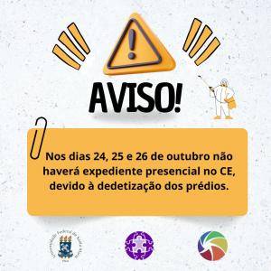 Diante disso, quinta e sexta-feira (24 e 25/10/2024), além de sábado (26/10/2024), NÃO HAVERÁ EXPEDIENTE PRESENCIAL nos prédios dedetizados para que seja feita a limpeza necessária. Nesse período, as atividades acadêmicas serão adaptadas, conforme acordo entre professores e turmas ou grupos de pesquisa, bem como entre chefias e servidores no caso das atividades administrativas.