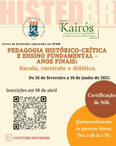 O curso ocorrerá quinzenalmente às quartas-feiras, de 26 de fevereiro a 18 de junho de 2025, das 14h às 17h, através da plataforma YouTube, no canal oficial do HISTEDBR.