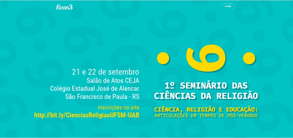 O 1º Seminário das Ciências da Religião, intitulado “Ciência, Religião e Educação: Articulações em Tempos de Pós-Verdade”, tem como público acadêmicos e docentes do Curso de Ciências da Religião UFSM/UAB. Visa promover um lugar para reflexões sobre os desafios da formação do profissional das Ciências da Religião e as contribuições da sua articulação com a educação, para o contexto caracterizado como “era da pós-verdade”. O evento visa também promover uma maior vinculação dos acadêmicos ao Curso, proporcionando momentos culturais, de diálogo e de reflexões acerca do tema do Seminário.