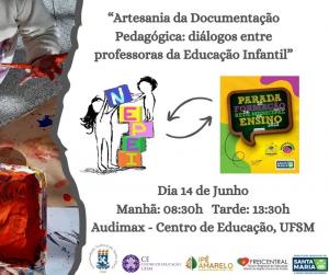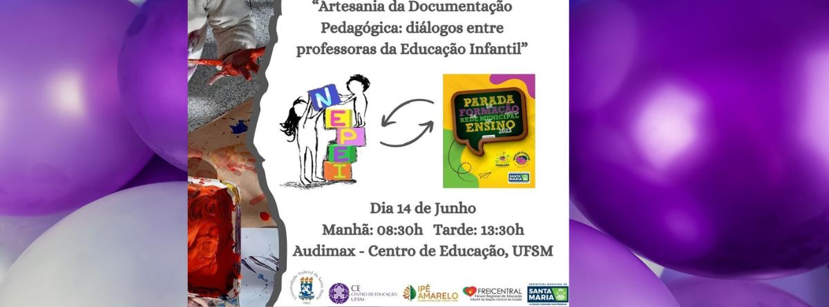 Nesta quarta-feira (14), ocorre no auditório Audimax/CE, nos turnos da manhã (a partir das 08h30min) e tarde (a partir das 13h30min), o evento intitulado Artesania da Documentação Pedagógica: diálogos entre professoras da Educação Infantil. O evento é fruto da parceria entre o Núcleo de Estudos e Pesquisas em Educação e Infância do Centro de Educação (NEPEI/CE) e Secretaria Municipal de Educação de Santa Maria (SMEd-SM).