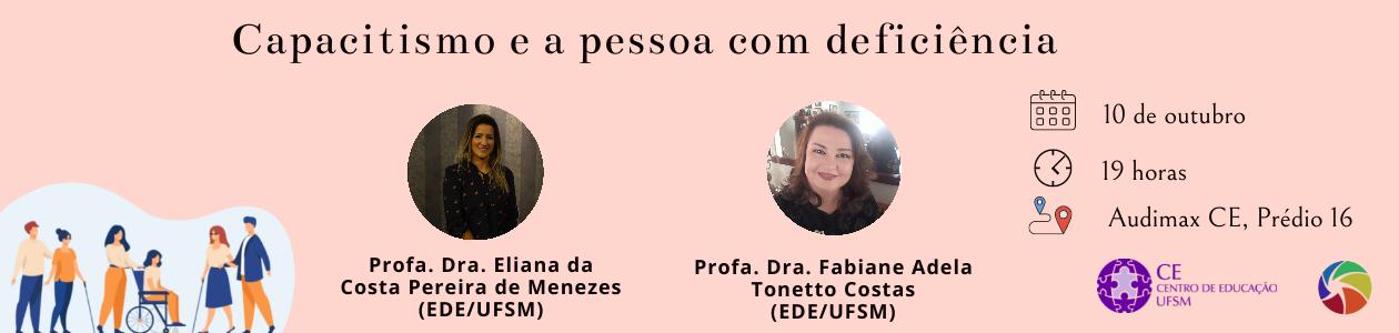 Palestrantes: Profa. Dra. Eliana da Costa Pereira de Menezes (EDE/UFSM) e Profa. Dra. Fabiane Adela Tonetto Costas (EDE/UFSM).