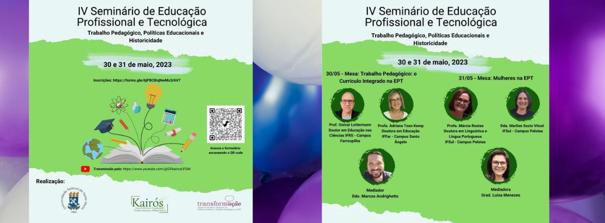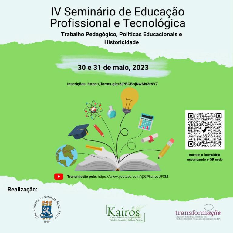 O Grupo de Estudos e Pesquisas sobre Trabalho, Educação e Políticas Públicas – Kairós, por meio do projeto de pesquisa Políticas Educacionais, Trabalho Pedagógico e Historicidade da Educação Profissional e Tecnológica no Rio Grande do Sul (FAPERGS), promove o IV Seminário de Educação Profissional e Tecnológica, com o tema: “Trabalho Pedagógico, Políticas Educacionais e Historicidade”, nos dias 30 e 31 de maio de 2023.