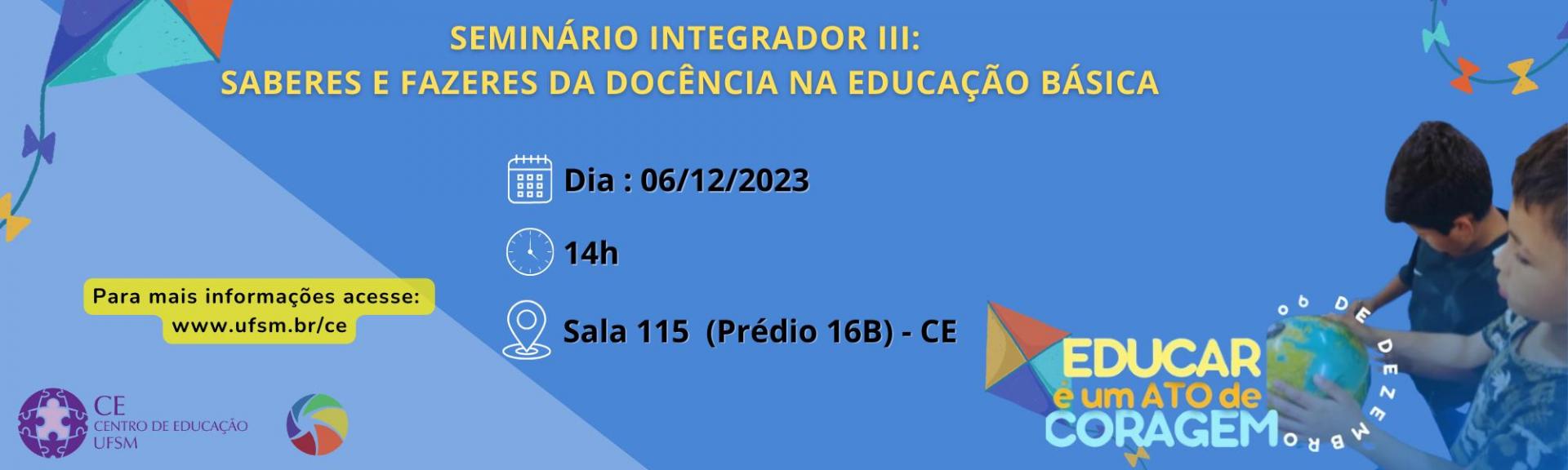 Convidamos a todos os acadêmicos para participar do Seminário Integrador III: Saberes e Fazeres da Docência na Educação Básica que acontecerá no dia 06/12/2023, nesta quarta-feira, às 14 horas, onde os estagiários irão discutir e socializar as práticas do estágio e falar sobre suas experiências.