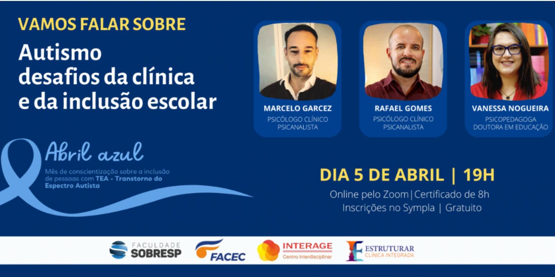 Para falar sobre esse assunto tão importante os cursos de Licenciatura em Pedagogia, Psicologia e Especialização em Psicopedagogia Clínica e Institucional da Faculdade SOBRESP (Santa Maria/RS), o curso de Psicologia da FACEC (Cristalina/GO), Interage- Centro Interdisciplinar de Atenção à Saúde e Ao Bem-Estar (Santa Maria/RS) e a Estruturar Clínica Integrada (Cuiabá/MT) convidam para um evento online com a temática: Autismo desafios da clínica e da inclusão escolar.
