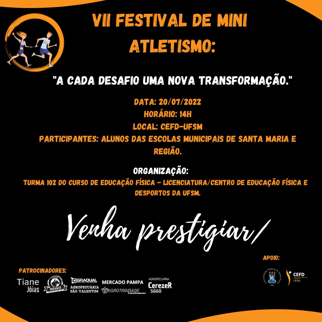 Na tarde do dia 20 de julho (quarta-feira), das 14h00 às 17h00, ocorrerá na nova pista de atletismo do CEFD o VII Festival de Miniatletismo: “A cada desafio uma nova transformação”, que visa oferecer atividades práticas de atletismo para 200 jovens estudantes de escolas públicas de Santa Maria e região.