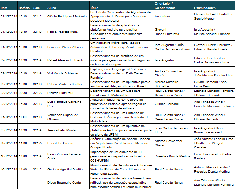 Acontece nos próximos dias as sessões de defesa dos Trabalhos de Graduação do Curso de Ciência da Computação do Centro de Tecnologia, conforme programação abaixo.