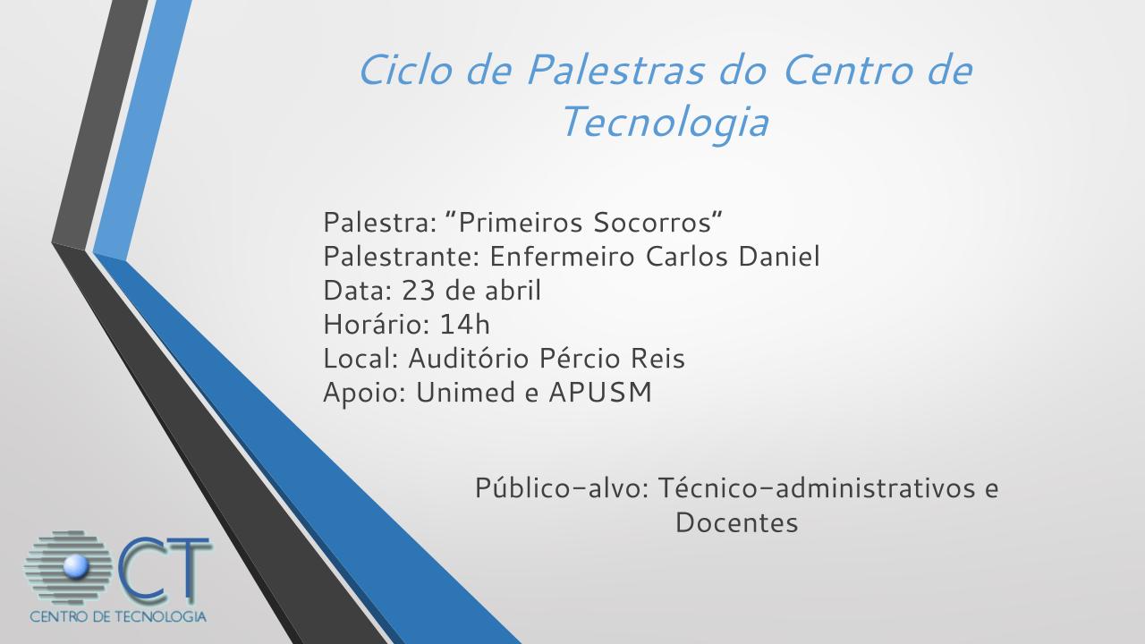 A Direção do Centro de Tecnologia convida todos os Servidores Docentes e Técnicos-Administrativos do Centro para a Palestra “Primeiros Socorros”, com o Enfermeiro Carlos Daniel, a se realizar na data de 23 de abril de 2015, às 14h, no Auditório Pércio Reis. O evento tem por objetivo atender a uma demanda antiga dos Servidores do Centro de Tecnologia acerca de procedimentos a serem tomados em situações de urgência e emergência. Na palestra, serão apresentados aspectos teóricos e demonstrações práticas das medidas utilizadas para prestação de socorro.