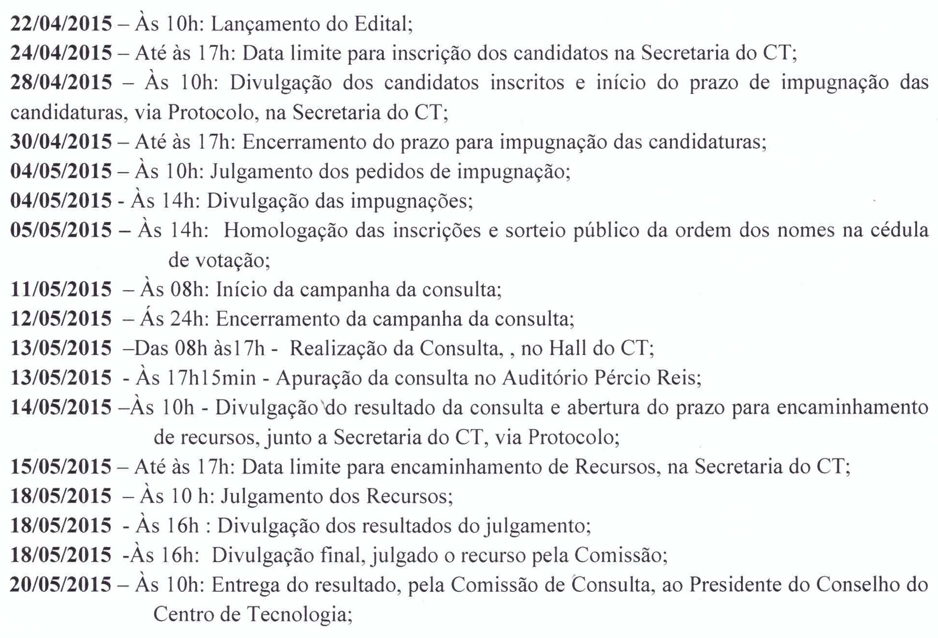 A Comissão de Consulta do Centro de Tecnologia, nomeada pela portaria N° 061/2015, de 13/04/2015, declara aberto o Processo de Consulta à Comunidade do CT para a escolha dos Coordenadores de Curso de Graduação em Engenharia Mecânica, Engenharia Química, Engenharia Civil, Engenharia de Produção, Ciência da Computação e do Programa de Pós-graduação em Engenharia Ambiental do Centro de Tecnologia, para o período 2015/2017.
