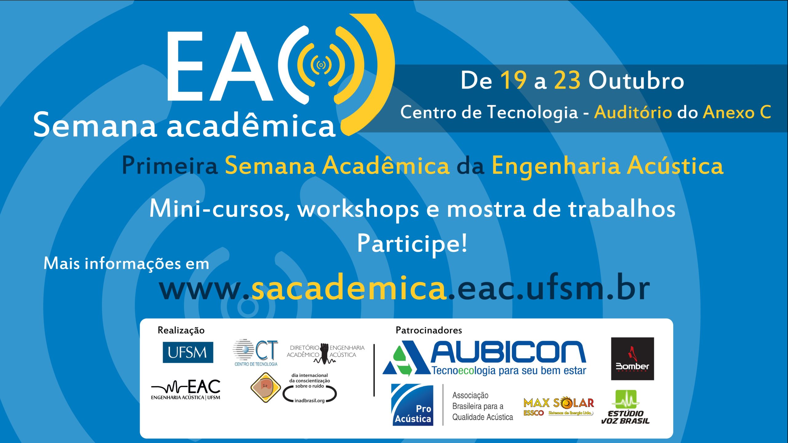 O curso de Engenharia Acústica do Centro de Tecnologia promove a sua 1° Semana Acadêmica. A 1° Semana Acadêmica da Engenharia Acústica acontece entre os dias 19 e 23 de outubro nas dependências do CT. Na programação, constam minicursos, workshops e mostra de trabalhos.