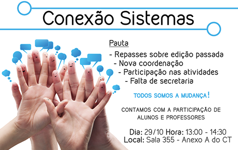 O Programa de Educação Tutorial do curso de Sistemas de Informação (PET-SI) promove, na próxima quinta-feira (29) a atividade “Conexão Sistemas”. A atividade tem como objetivo discutir temas relevantes ao dia-a-dia do curso de Sistemas de Informação, levantando questões sobre a grade curricular, metodologia de ensino, entre outras. Nesta sessão contamos com a presença de alunos e professores que terão a oportunidade de dialogar em busca de melhorias para o curso em todos os aspectos. Nesta edição contaremos também com a presença da atual coordenadora do curso para apresentar os repasses da edição anterior. Participe!