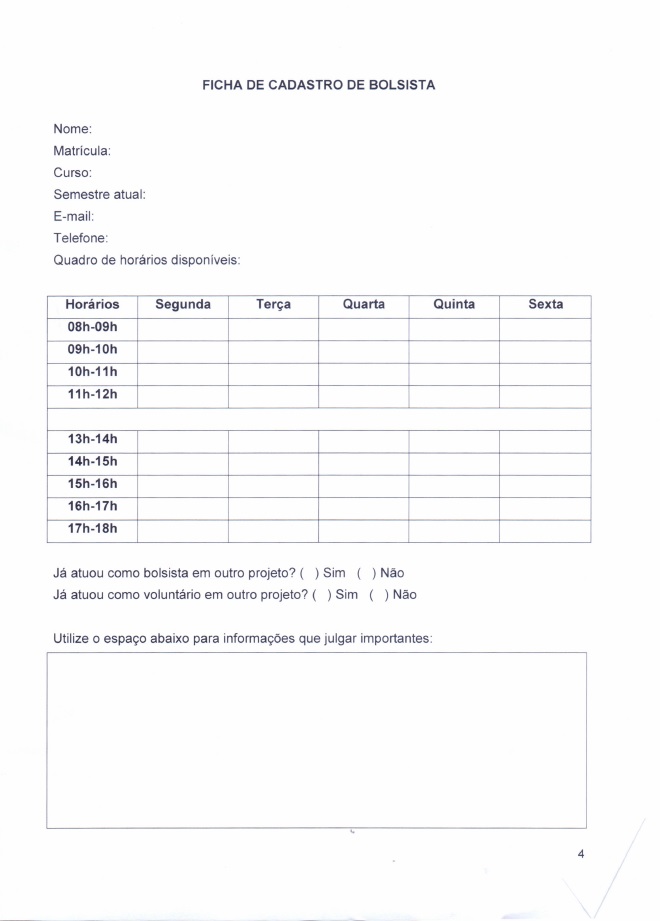 A documentação obrigatória é: ficha de cadastro de bolsista e histórico escolar atualizado.