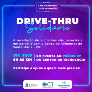 Nesta sexta-feira, 21 de maio, o Centro de Tecnologia da UFSM em parceria com o Banco de Alimentos de Santa Maria, irá promover o Drive Thru Solidário. Uma ação que visa promover a arrecadação de alimentos que serão distribuídos para as famílias carentes da cidade. O Drive será realizado em frente ao prédio 07 do CT, das 8h às 12h, e toda a comunidade santamariense está convidada a participar.