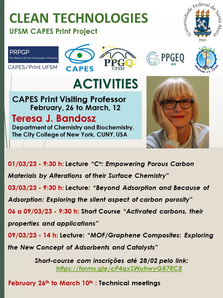 A pesquisadora Teresa Bandosz irá realizar uma Missão de Trabalho através do Programa Capes Print, que envolve os Programas de Pós-Graduação da Engenharia Química, da Engenharia Ambiental e da Química da UFSM. Entre os dias 27 de fevereiro e 10 de março, ela estará no Brasil para realizar uma série de palestras sobre sua pesquisa. Na UFSM, além das palestras, Bandosz também irá realizar um short-course entre os dias 06 e 09 de março, a partir das 09h30. As inscrições para o curso “Activated Carbons, their properties and applications” são limitadas e podem ser realizadas até dia 28 de fevereiro, através do formulário. As palestras serão de acesso livre, respeitando a capacidade máxima dos auditórios.