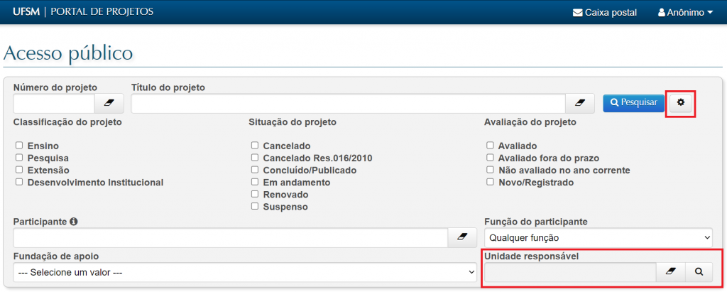 Para encontrar um projeto específico, o aluno pode entrar no acesso público e digitar na barra de pesquisa o número ou o nome do projeto. Caso o aluno queira navegar pelos diversos projetos de um departamento, ou núcleo do Centro, é possível filtrar a busca ao clicar na engrenagem à direita da barra de pesquisa, e especificar a Unidade Responsável para buscar todos os projetos vinculados ao departamento ou núcleo. No Portal, podem ser encontradas informações como o resumo dos projetos, seus objetivos, justificativas, resultados esperados e quais são os participantes. A Subdivisão de Projetos (SPROJ) é responsável por assessorar a elaboração, registro, acompanhamento e a avaliação destes projetos.