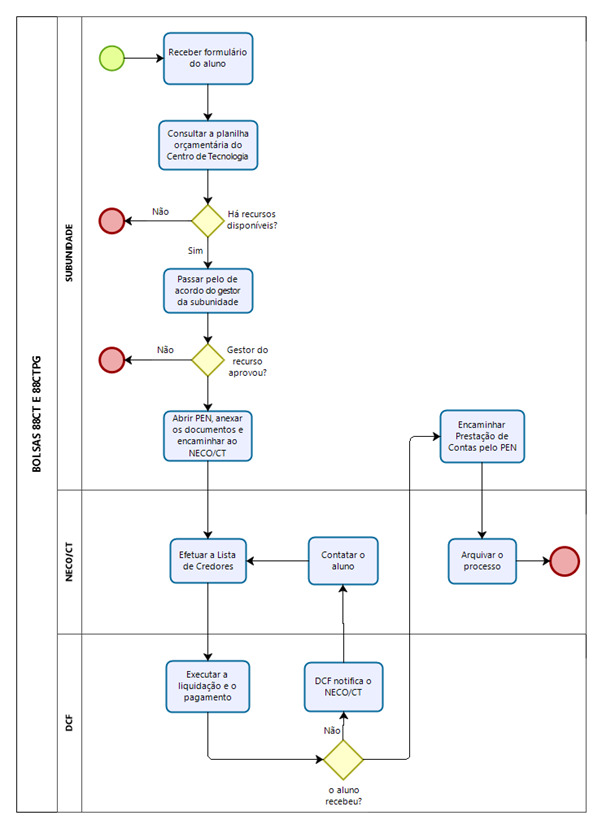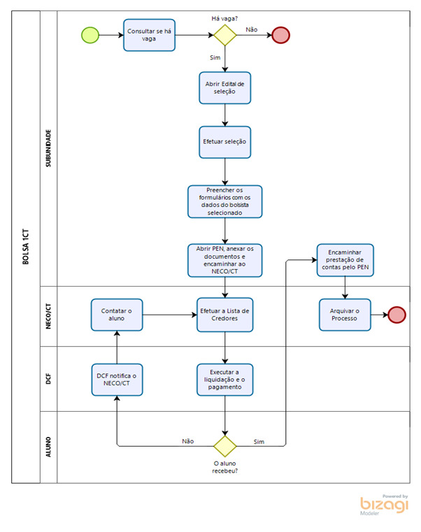 Os formulários contendo as solicitações para o pagamento deste auxílio deverão ser encaminhadas ao Núcleo de Gestão Orçamentária/CT, até o dia 10 de cada mês para a Bolsa 1CT – Monitoria. Para as demais bolsas, o encaminhamento deverá ser realizado até o dia 15 de cada mês. Os pagamentos são realizados na primeira semana útil do mês subsequente ao encaminhamento da solicitação.
