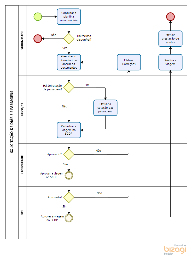 - O pedido de concessão de diárias e passagens deverá ser feito pela entrega do Formulário de Solicitação de Viagens e Passagens, por meio físico ou e-mail(financeiro.ct@ufsm.br), junto com os documentos comprobatórios do objeto da missão, da localidade, das datas e horários (convite, convocação, carta de aceite, programação do evento, inscrição no evento, folder, panfleto);