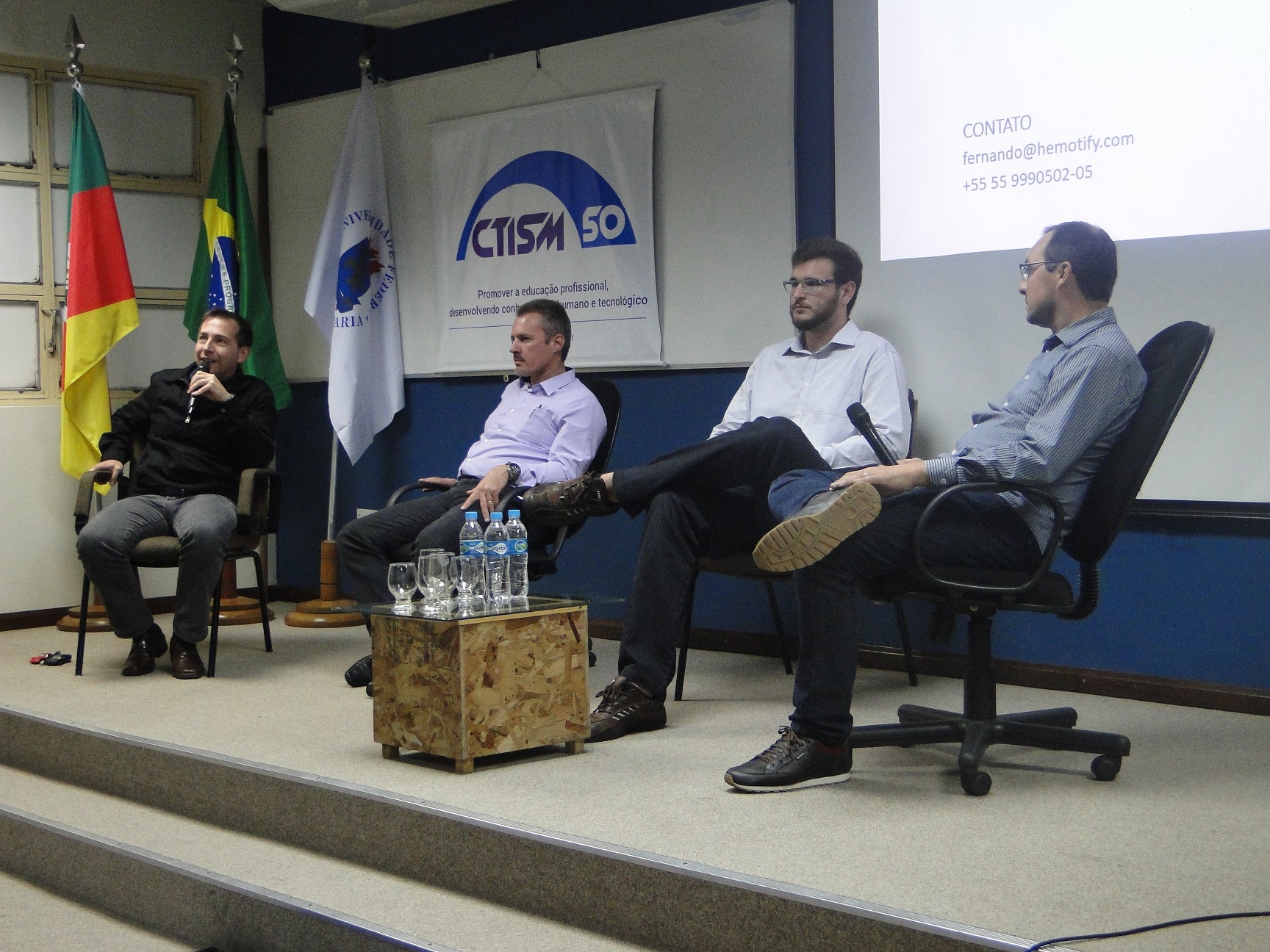 Três ex-alunos do CTISM debateram experiências de empreendedorismo na noite desta segunda-feira (17), no auditório da escola. O evento, organizado pelo colégio em parceria com a Liga de Empreendedorismo i9, foi assistido pelos alunos de último ano dos cursos subsequentes.