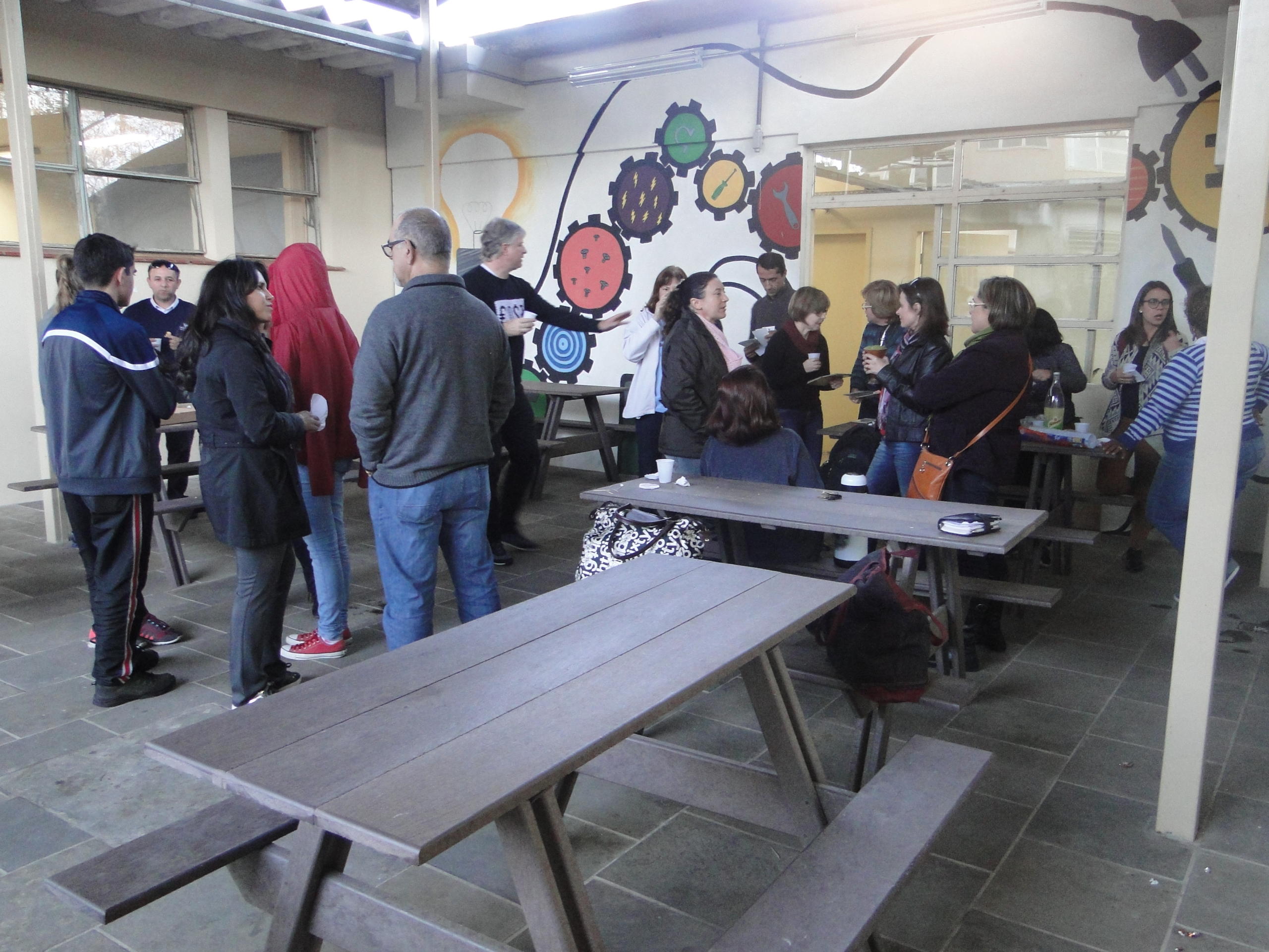 O Grupo de Revitalização do CTISM realizou, na tarde desta quinta-feira (27), a segunda edição do seu happy hour mensal no pátio interno do colégio. Cerca de 20 servidores participaram do evento, que teve salgadinhos e refrigerante. A proposta do happy hour é reunir os servidores para momentos de convivência nos espaços públicos do CTISM.