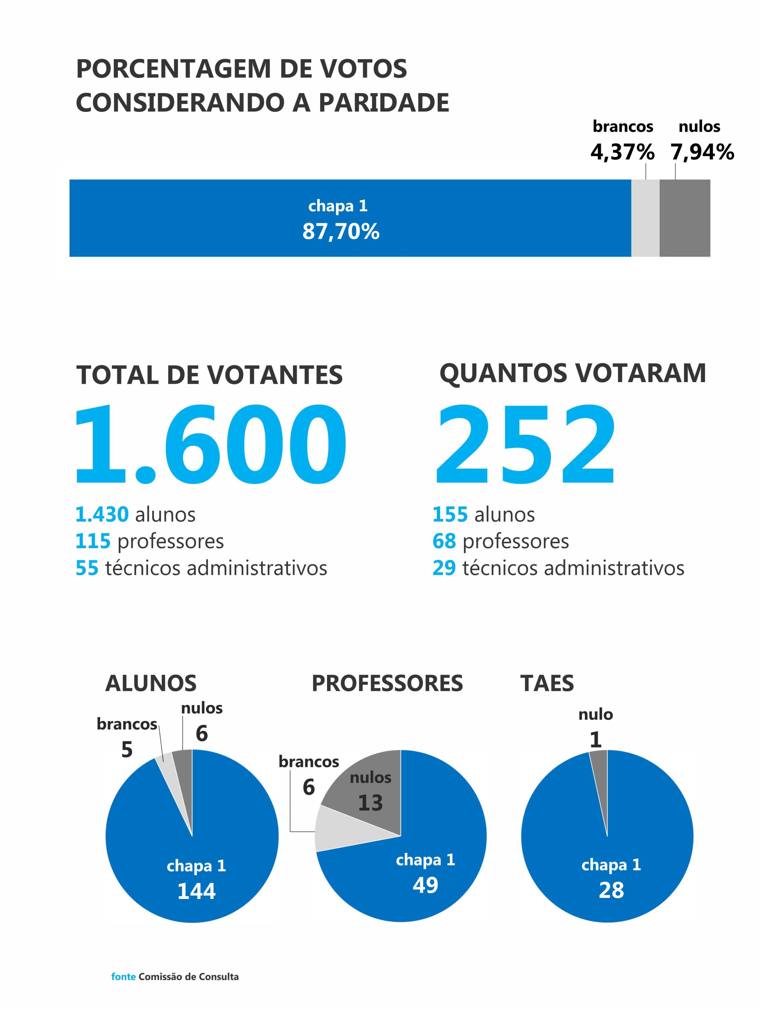 Nesta sexta-feira, a Comissão de Consulta informou as porcentagens finais da votação para a Direção. Considerando a paridade de um terço para cada segmento (alunos, docentes e técnicos administrativos), a chapa Rafael-Fabio obteve 87,70% dos votos totais. Os votos nulos somaram 7,94% e os brancos, 4,37%.