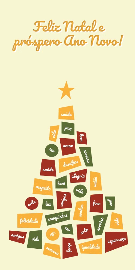 Que neste Natal o amor e a esperança preencham seus corações, e que o Ano Novo traga grandes realizações e muita felicidade. Que haja saúde, alegria e bons sentimentos para compartilhar. E que cada um celebre essas festas junto dos que mais ama.