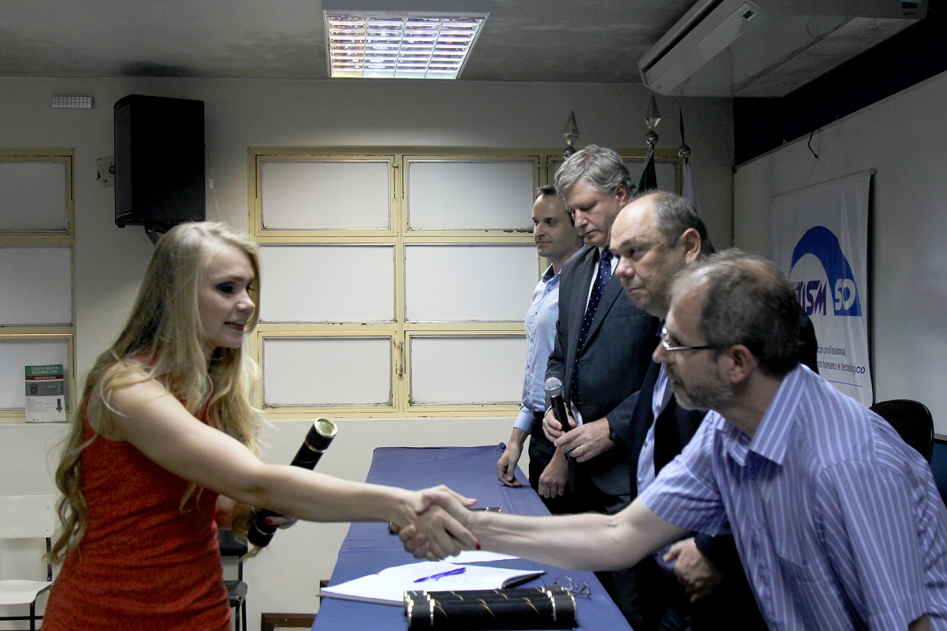 Os juramentos foram prestados pelos alunos Marcel Ricardo de Oliveira Santana (Redes) e Bruno Cielo (Fabricação Mecânica). Em seguida, Alessandro fez a imposição de grau para cada formando.