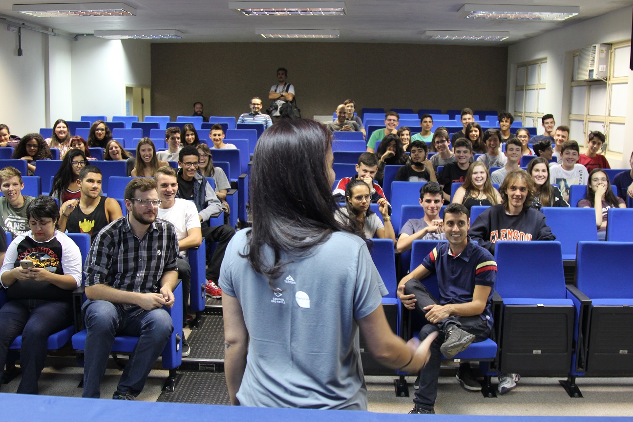 Larissa Meyer, que comandou o XperienCTISM, fala a alunos durante os primeiros momentos do evento na tarde de sexta-feira (16), no auditório.