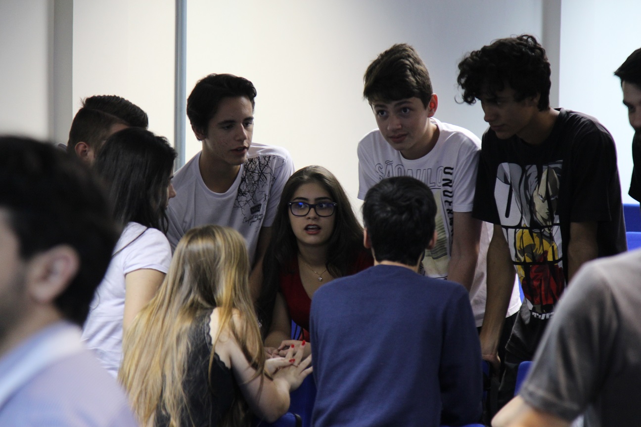 Alunos do CTISM participam de uma das primeiras dinâmicas do evento XperienCTISM, na tarde de sexta-feira (16), no auditório do colégio.