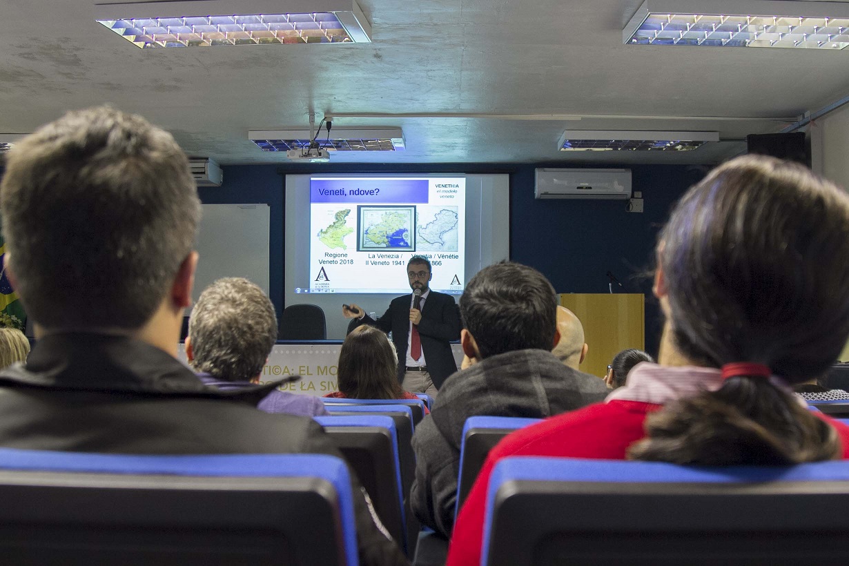 A primeira atividade oficialmente vinculada ao convênio foi uma palestra na tarde de terça-feira (17) de Mocellin sobre o modelo de desenvolvimento da civilização vêneta. Ele resgatou a história da República de Veneza – o Estado vêneto que dominou o comércio com o Oriente durante a Idade Média. Mocellin citou o comércio de âmbar praticado por Veneza, a primeira rede comercial estabelecida na Europa, e lembrou do sistema político do país, que era governado por um doge eleito enquanto os demais Estados europeus eram monarquias feudalistas. Para o diretor da Academia da Língua Vêneta, a cultura vêneta é marcada pela resiliência e pela cooperação, que dispensa a hierarquia.