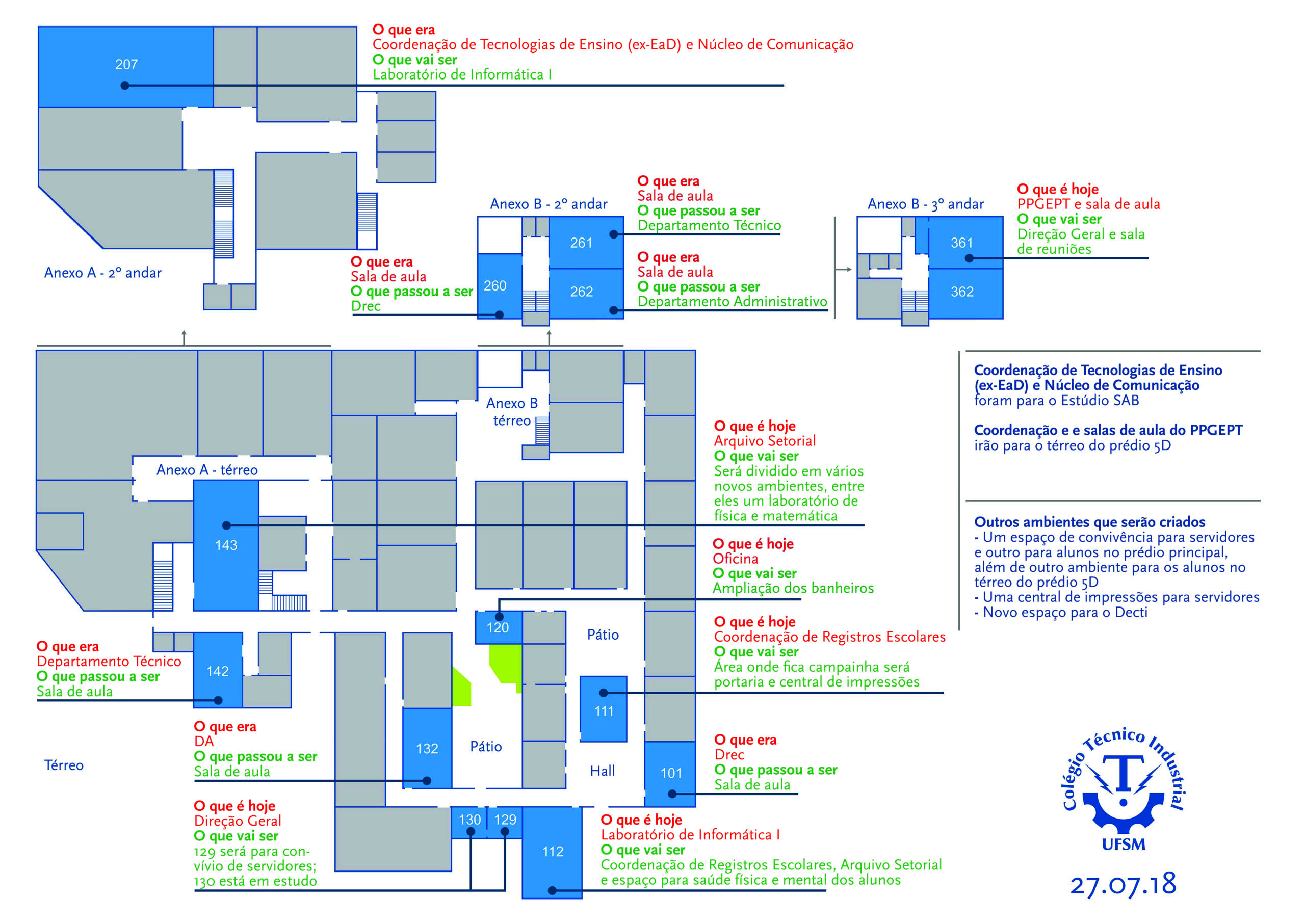O CTISM deu início nesta semana a uma série de mudanças nos espaços físicos com o objetivo de melhorar os fluxos de trabalho e otimizar o uso dos ambientes. O anexo B do prédio principal, que até o início da semana abrigava a coordenação do PPGEPT (Programa de Pós-Graduação em Educação Profissional e Tecnológica) e salas de aula, vai agora concentrar a Direção e os setores administrativos do colégio.