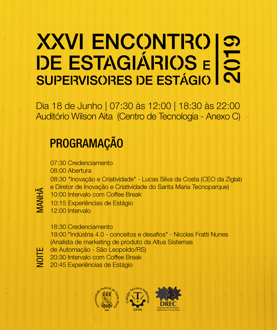 No dia 18 de junho, no auditório Wilson Aita (Centro de Tecnologia – Anexo C), o XXVI Encontro de Estagiários será realizado pelo CTISM. O evento anual, que acontecerá em dois turnos, objetiva preparar os alunos para o mercado de trabalho. Na ocasião serão abordados temas como Inovação e Criatividade e Indústria 4.0.