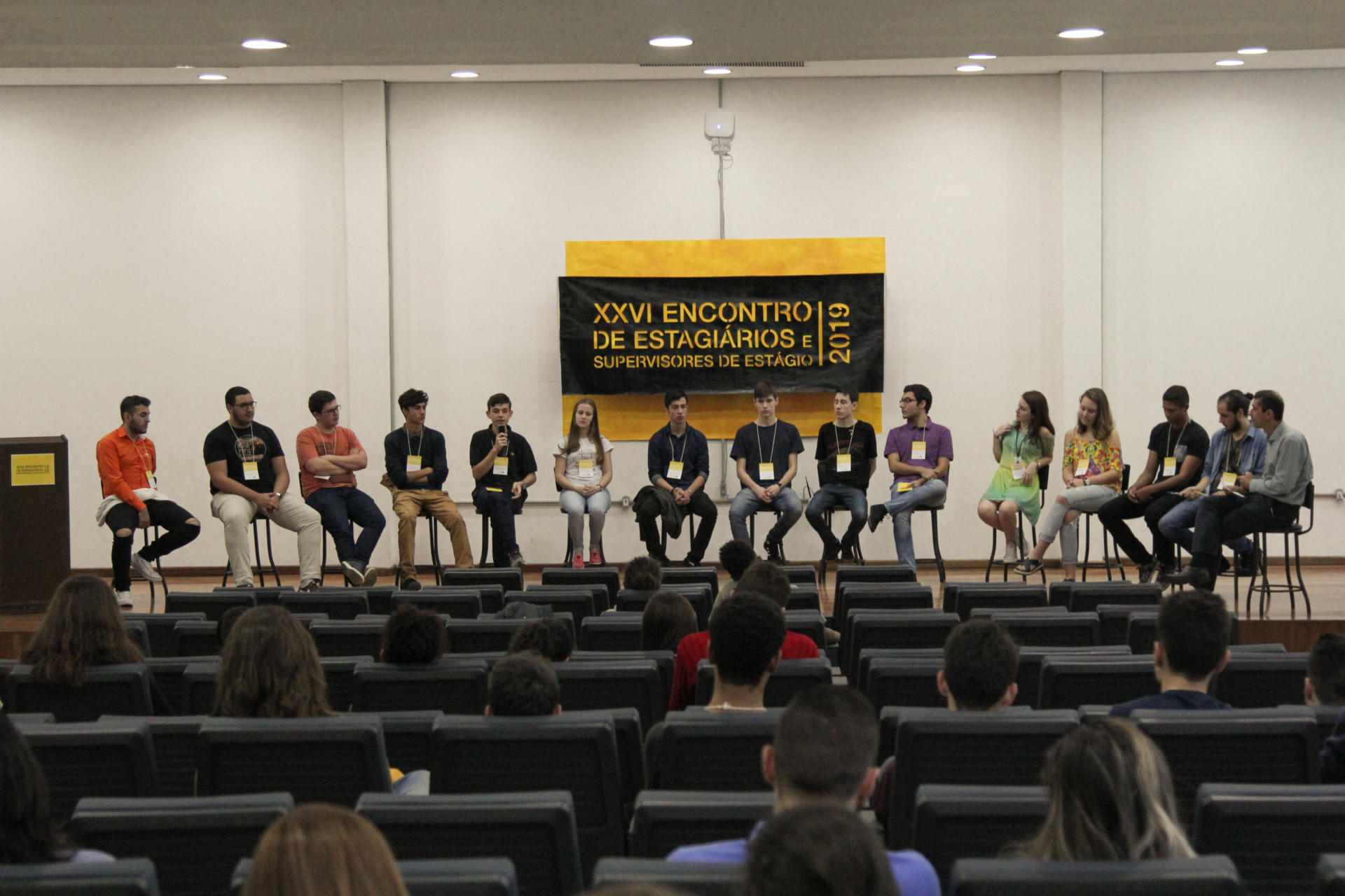 Após a degustação do Coffee Break, o público se reuniu novamente no auditório para prestigiar os relatos de ex-alunos sobre as suas experiências de estágios, onde puderam conversar sobre os diversos tipos de estágio disponíveis e seus desafios e possibilidades. O público aproveitou para tirar dúvidas, entre elas sobre como foi feita a conciliação de estudos e estágio e sobre as burocracias envolvidas no processo.